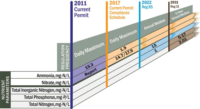 Indeed, when the moment arrives, the 75th Street WWTF will be ready. Construction for the Bardenpho transition is planned for 2015, while startup and testing will be finalized in 2016. The story doesn’t end there, as even more regulations are scheduled to be enacted in 2022 and 2031 (see figure below). Of course, the ever-prepared Boulder facility already has a plan for those regulations as well (fodder, perhaps, for future Water Online case studies).