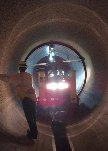 The existing tunnel was approximately 132-inches in diameter and the 120-inch CCFRPM pipe has an outside diameter of 126-inches. This allowed a clearance of only three inches which due to the high strength thin walled Hobas pipe, maximized the I.D. post rehab.