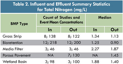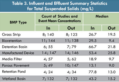 And what about sediment? It looks like there are a number of options for reducing total suspended solids (TSS). As shown in Table 3, most BMPs were able to bring TSS concentrations down below 20 mg/L, but filtration-based BMPs, like bioretention and media filters, were the most effective, with median effluent concentrations around 10 mg/L, followed by BMPs with permanent pools, such as retention ponds and wetland basins.