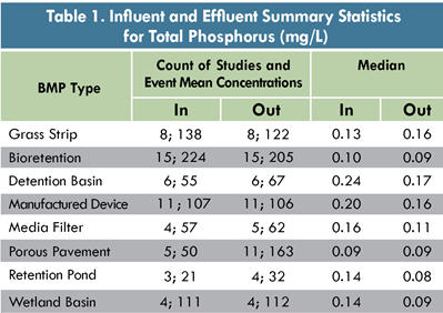For example, the report points out that phosphorus has a tendency to attach to soil particles and other organic matter, which makes it a good candidate for BMPs with processes that remove particulates, such as sedimentation and filtration. As shown in Table 1, wetland basins and retention ponds, both BMPs containing permanent pools, proved to be particularly good options, and media filters also reduced levels substantially. On the other hand, some vegetated BMPs, like grass strips, might actually leach phosphorus from soil or planting material and resuspend captured particulates.