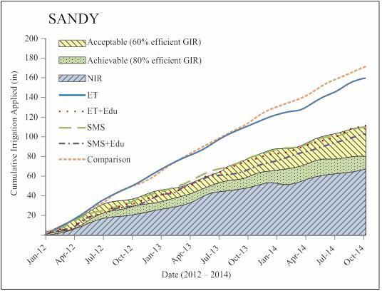 In the sandy soils, the ET treatment technology irrigated significantly more than both SMS treatments and the ET plus education treatments. In the sandy soil locations, the ET treatment groups that had received education had significantly lower average irrigation application than the other groups. The educational component favorably impacted average irrigation application for the ET technology in the sandy soils.