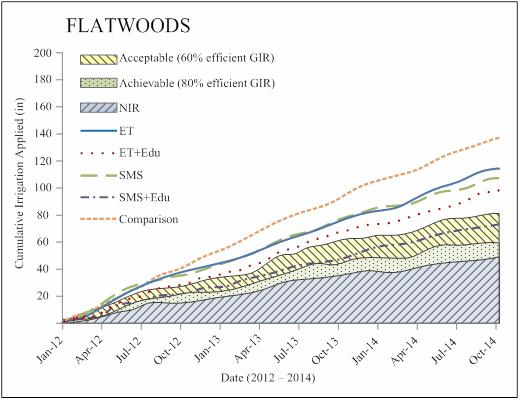 On average, ET irrigation controller treatments reduced irrigation by 18 percent across both sandy and flatwoods soils for the non-education group, and 32 percent for the education group. The SMS technology reduced irrigation by 30 percent for the non-education group and 42 percent for the education group across both soils. The educated groups had a trend for less irrigation than their non-education counterparts. A post-test survey showed that the level of irrigation knowledge did not differ between the groups receiving education and the non-education treatment groups; therefore, it is speculated that the education groups irrigated less due to the optimized control settings for site-specific parameters.