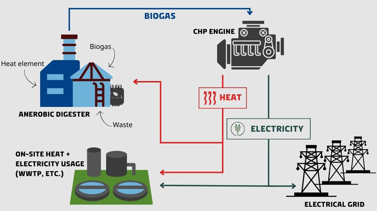 Energy generation through CHP: Our use of combined heat and power (CHP) technology is a key highlight. These units efficiently convert biogas into electricity and heat, maximizing the energy content of the biogas and providing sustainable solutions for both power and heating needs.