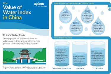 The 2014 Xylem Value of Water Index: China was released today at the China Water Expo in Beijing by Xylem Inc., a leading global water technology company focused on solving the world’s most challenging water issues. The Xylem 2014 Value of Water Index is the third installment of the Value of Water Index, and the first to be conducted outside of the United States. The research was conducted in partnership with China Water Net of the E20 Environment Platform, a leading consulting firm focused on the intersection of environment and industry.