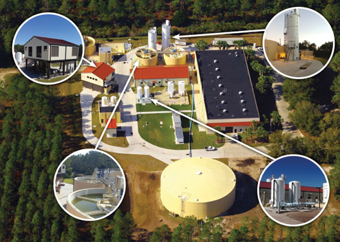 An aerial view of WTP No. 2 shows many of the facilities built to treat and recover the plant’s RO concentrate as an alternative water supply using the ZLD process, including (clockwise from top left) a sludge dewatering facility, a lime silo, a posttreatment and ultrafiltration building, and solids contact clarifiers.