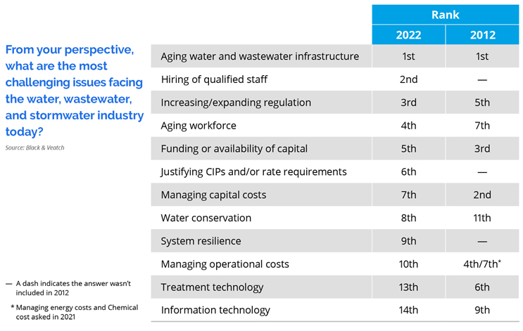 As with each year the survey has been conducted, the 2022 outreach began with a call to identify the industry’s pressing issues. To little surprise, aging infrastructure topped the list, as it did in 2012. The second largest challenge in 2022 — hiring of qualified staff — wasn’t an option in the 2012 survey. This, along with issues around the industry’s aging workforce (also rising in the survey from seventh to fourth), underscores the significant strain to develop and retain human capital resources.