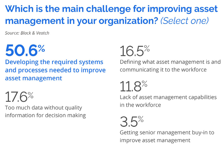 When asked what they found to be the main challenge for improving asset management, nearly one-fifth — 18% — of respondents selected “too much data without quality information for decision-making,” while “developing the required systems and processes” — which nowadays often includes data collection and management — was the highest concern.