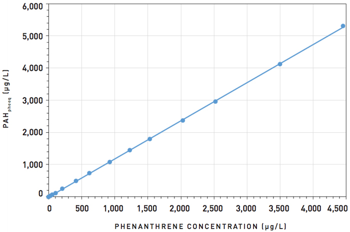 Figure 4. UviLux PAH+ sensor dose-response curve to phenanthrene, demonstrating the excellent linearity (R2 = 0.99998) that can be achieved across the full range from 0 to 4500 µg/L, with integrated absorbance correction