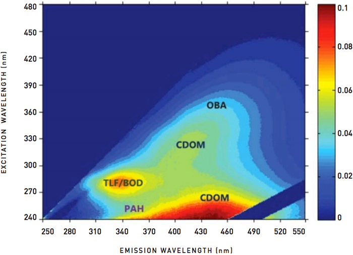 Figure 3. Fluorescence excitation-emission matrix of a natural freshwater sample, indicating PAH, TLF/BOD, CDOM, and OBA, as measured by Chelsea Technology Group’s UviLux fluorescence sensor