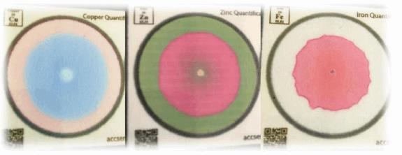 Figure 2: Images of completed copper, zinc, and iron water tests. The area of the circular color change is directly proportional to the concentration of analyte in the water sample.
