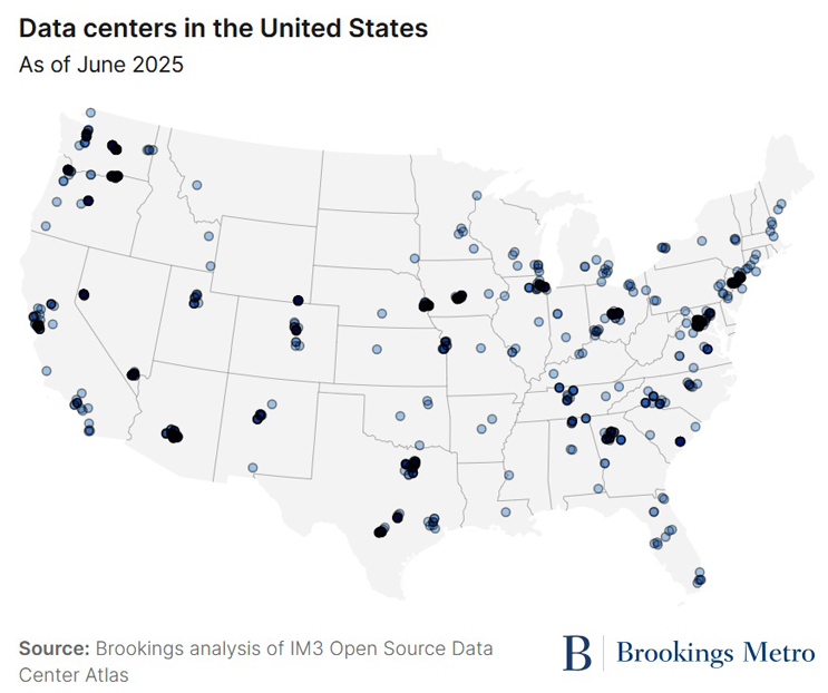 The result is a complex challenge not only facing tech firms and economic development leaders, but also the individual water systems responsible for providing service. Increasingly, more systems in more places are grappling with data centers’ water impacts—and those of an AI-driven world more generally—including significant and ongoing water use; expanded infrastructure costs such as new distribution lines to reach exurban facilities; and other regulatory and financial pressures. Even as data centers may depend more on water reuse technologies or onsite water sources, that does not change the fact that water stresses are still hitting different regions with greater frequency and intensity. In addition, the concentration of existing or potential facilities means some regions are facing more intense demands, particularly water-stressed areas in the West and Southwest.