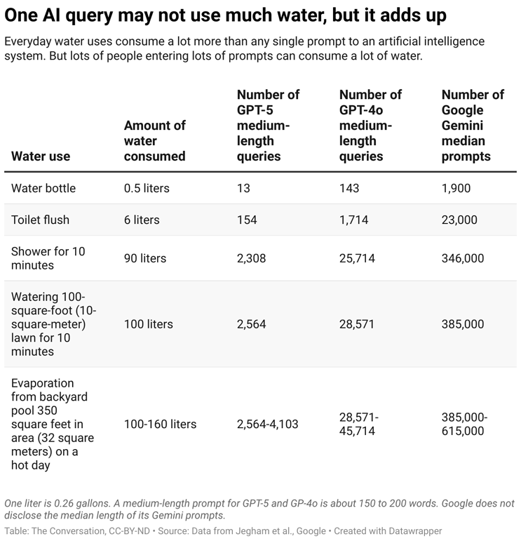 When multiplied by millions, AI queries’ water use adds up. OpenAI reports about 2.5 billion prompts per day. That figure includes queries to its GPT-4o, GPT-4 Turbo, GPT-3.5 and GPT-5 systems, with no public breakdown of how many queries are issued to each particular model.