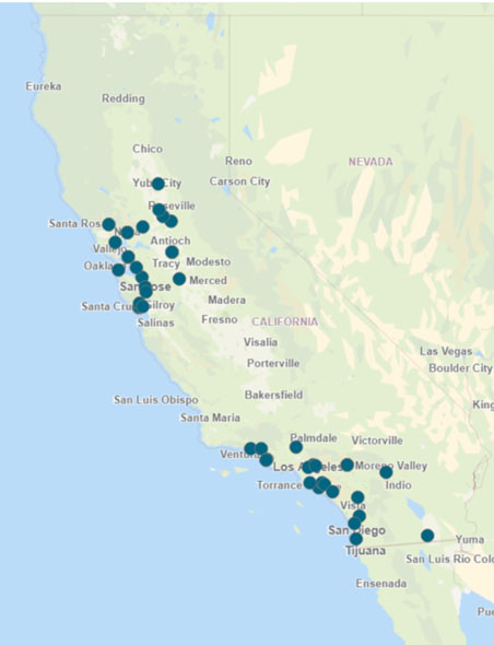 Advanced metering infrastructure (AMI) integrates hardware, data management, and communications systems for real-time data collection with two-way communication between water service providers and their customers. This technology is particularly impactful in drought prone areas, incentivizing water conservation and alerting both service providers and consumers to possible leaks in real time (Moore and Hughes 2008). Researchers at UC Berkeley have used FirmoGraphs’ database of meeting minutes and capital improvement plans to analyze recent trends in AMI adoption among California drinking water agencies. In the last two years, nearly 50 cities and water districts have adopted advanced metering infrastructure. More recent AMI adopters are located in the Bay Area, Los Angeles, and San Diego metro areas than the remaining regions of California, which include agricultural areas.