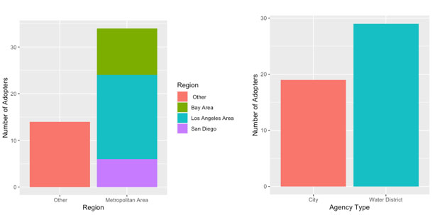 Overall, agencies in California have adopted AMI to support water conservation and consumer engagement, particularly in urban areas with technologically savvy users. While AMI deployment can be costly, strategic rollout and state grant support have impactfully helped agencies manage adoption. Knowledge sharing between early adopters and prospective agencies can also facilitate technology adoption going forward.