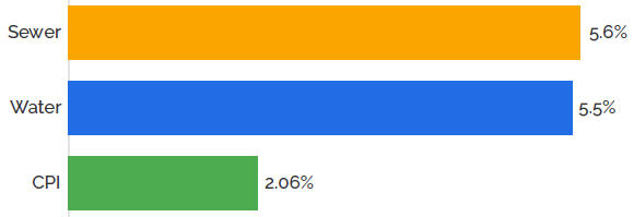 - Rate Growth. The analysis found that the compound average rate of change for surveyed sewer bills (5.6 percent) and water bills (5.5 percent) outstripped the compound rate of increase in the Consumer Price Index (2.06 percent) over the surveyed period from 2001 through 2020 (Inset A). This ultimately makes water utility charges an increasingly larger portion of customer cost-of-living expenses — a particular concern for historically lower-income households and those impacted by the COVID-19 pandemic.