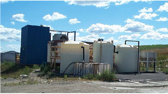 Based on favorable treatment results of the passive systems with pretreatment, a pilot plant study was implemented for the fixed film biological pretreatment and two passive treatment systems consisting of a 4-stage Constructed Wetland and a 2-stage Peat and Woodchip Filter system (Figure 1). The main objectives of the pilot plant study were to obtain more detailed performance data to assess the proposed systems, and determine other system-specific design parameters that were not addressed in the bench-scale study. Photograph 1 shows the storage and fixed film tanks and the wetland systems.