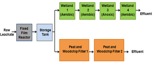Figure 1. Case Example A: Schematic flow diagram of the pilot plant leachate treatment system