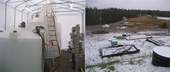 This Case Example involves the pilot plant study for treatment of leachate from a landfill that receives non-hazardous solid waste from the Ottawa residents and businesses. CRA completed a pilot project of a BNR LTF as part of a study to determine whether a nitrification denitrification biological system could produce an effluent quality that met the sewer use by-law for indirect discharge to the City of Ottawa sanitary sewer. The pilot plant system consisted of four tanks: 1-5,000 L anoxic tank, 1-6,000 L aeration tank, 1-1,200 L clarifier tank and a waste activated sludge storage tank. The pilot plant was operated in MLE mode and designed for an overall HRT of 2.75 d (anoxic and aerobic HRTs of 30 and 36 hrs, respectively). Photograph 2 shows the three tanks for this pilot plant study.