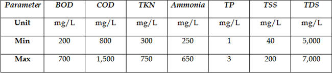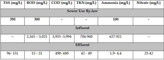 The pilot plant was operated at varying flow rates to determine the required HRT for sufficient leachate treatment. One of the objectives of the Pilot Plant study was to investigate the impact of high Total Dissolved Solids (TDS) on the performance of the biological system as the leachate was characterized by high TDS concentration up to 11,000 mg/L. The modelling of the nitrification denitrification process using BioWin indicated that to achieve satisfactory levels of denitrification, internal recycle between the aeration and anoxic tanks needed to be set at 10 times the influent flowrate. Phosphoric acid was added as a phosphorus source. Influent and effluent samples were collected to determine the effectiveness of the pilot plant system at various HRTs. Influent and effluent leachate quality is presented in Table 2 with City of Ottawa Sewer Use by-Law limits for key parameters shown.