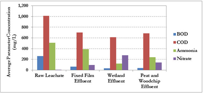 Six-month operation of the pilot plant system indicated that the fixed film biological pretreatment system has shown low biological activity and therefore has been ineffective at removing raw leachate BOD. The detailed analysis of the fixed film media samples indicated that attached growth was primarily inorganic. For the passive systems, the Peat and Woodchip Biofilter showed poor nitrification results with average effluent ammonia concentrations of 177 mg/L. The Constructed Wetland system showed some promising results during the warmer months, but the average effluent ammonia concentrations was 36 mg/L during the colder months. Although the Constructed Wetland has shown promising results, it failed to demonstrate a consistent capability to reduce ammonia concentrations below the expected discharge criteria of 1 mg/L. Figure 2 presents the profile of organics and nitrogen compounds in the pilot plant system.