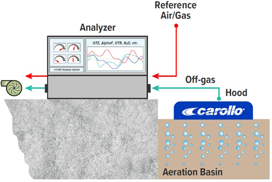Aeration, a critical component of biological treatment at WRRFs, accounts for over 50% of a facility’s total energy consumption, making it the most energy-intensive process. Therefore, optimizing aeration efficiency is essential for cost savings and environmental sustainability. Floating hoods atop aeration basins can be used to collect the off-gas to be sent to a gas analyzer that measures the relative concentration of different gas species. This practice, known as off-gas testing, has become the gold standard for evaluating aeration efficiency and accurately measuring GHG emissions.