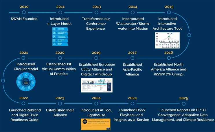 Over the years, SWAN has expanded its mission to address not only drinking water, but also wastewater and stormwater, reflecting the evolving needs of the global water sector. In 2011, SWAN introduced the 5-Layer Model, which has become a globally recognized framework for defining what a smart water network is and how it interconnects. This model was updated in 2021 to a circular model, incorporating people, processes, and value creation, or the “why” of the smart water journey, which is now widely in the industry. Below is a timeline of SWAN’s evolution.