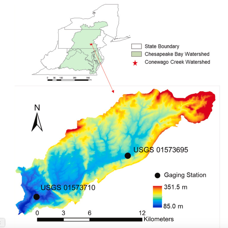 The location of the 52-square-mile Conewago Creek drainage within the Chesapeake Bay watershed is shown in this graphic. The stream is monitored by two U.S. Geological Survey gauging stations, that provided data for the research.