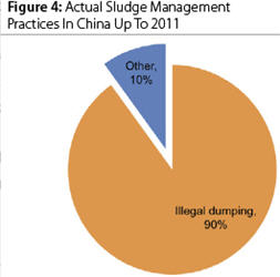Throughout this process of investment in new WWTPs, sludge management has been very much an afterthought. While a national sludge management plan (figure 3) was drawn up, the prevailing sludge disposal method up until 2011 was illegal dumping, which accounted for more than 90 percent of volume, as shown in figure 4. This was partly due to regulatory restrictions on landspreading and landfill. In China, the mainstream sludge treatment technology is anaerobic digestion (AD). However, currently only 50 out of approximately 4,000 (<1 percent) WWTPs have installed AD facilities. Due to a chronic lack of operational experience and knowledge, only around 30 of those 50 plants actually operate their AD equipment. Other sludge treatment options available in China include aerobic composting and drying.