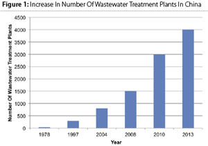 China’s heavy investment in wastewater treatment in the past two decades has seen the number of wastewater treatment plants (WWTPs) increase dramatically (figure 1). At the end of March 2009, there were 1,590 completed and another 1,885 under construction. By 2010, there were approximately 3,000 — a number expected to double during China’s 12th Five-Year Plan from 2011 to 2015. In 2013, the estimated number of WWTPs reached 4,000. On average, the country is building 300 to 500 each year.