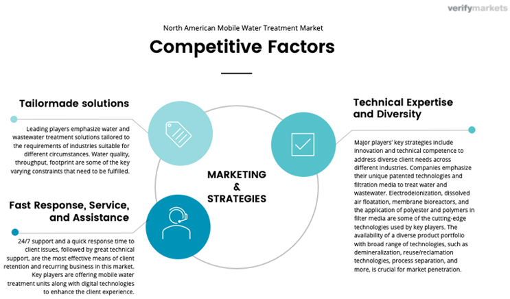 Intense competition – The mobile water treatment market has several companies competing to gain market share. The market leader in 2022 was Evoqua Water Technologies. Evoqua’s success can be attributed to its diverse product offering, innovation, and quick response time to meet customer expectations. Some of Evoqua’s largest customers are power plants, refineries, and chemical plants.