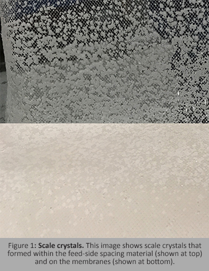 There is typically at least one salt in any natural water source that will concentrate beyond its solubility and potentially form scale. Preventing scale formation (Figure 1) should not be a major challenge unless the water source has an unusually high concentration of a slightly soluble salt, or unless the RO is being operated with an unusually high permeate recovery.