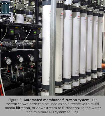Membrane filtration is becoming more common in various applications, including pretreatment for RO systems. It can often provide water that is more consistently low in its concentration of suspended solids than that provided by a pressurized multimedia filter. Therefore, these systems may be used as an alternative to multimedia filtration, or possibly downstream to further polish the water and minimize RO fouling.