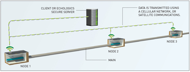 - Once activated, the EchoShore-TX system collects data about the transmission main. At assigned times, the information is uploaded to a secure server where advanced algorithms interpret the data and generate reports. Acoustic nodes are installed along the transmission main. Additional nodes can be rapidly installed and connected to the network as required.