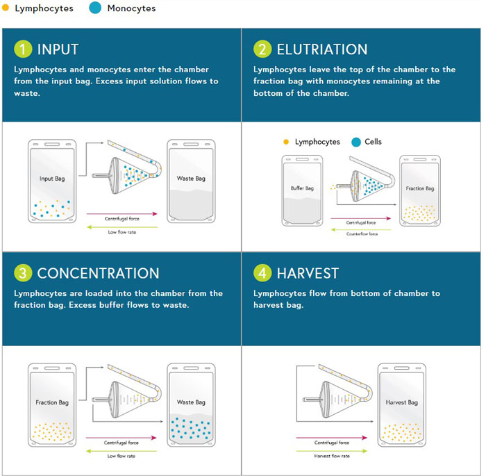 Our counterflow centrifugation system operates on the principle of elutriation. Elutriation is a process for separating cells based on their size, shape and density. Discover the four stages in the lymphocyte elutriation process.
