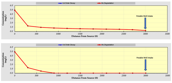 Figure 1. Comparison of contaminant migration along a plume centerline using the EPA's BIOSCREEN Natural Attenuation Decision Support System model, assuming a continuous source, a model run time of 30 years, no degradation, and contaminant retardation factors of Rf = 1 = groundwater (top chart) and Rf= 5 (bottom). Simulation shows that a contaminant plume with Rf=5 will not reach a hypothetical potable well intake 3,000 feet away after 30 years.