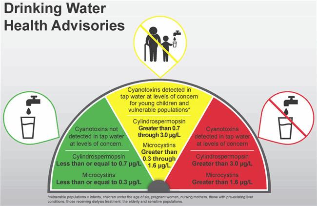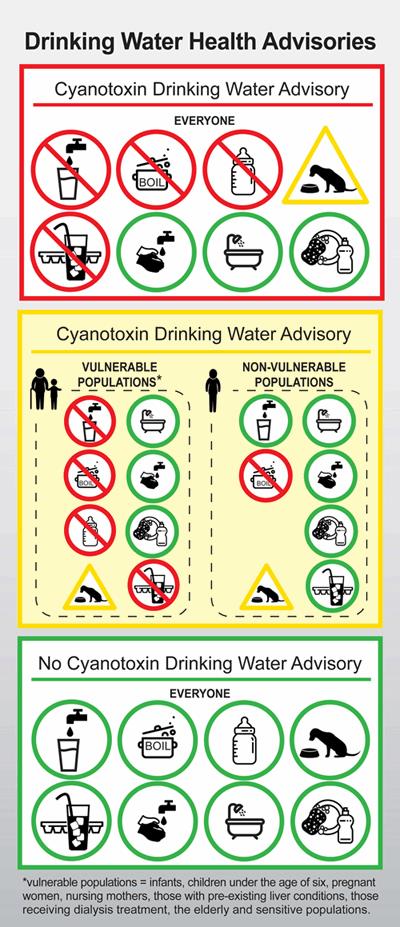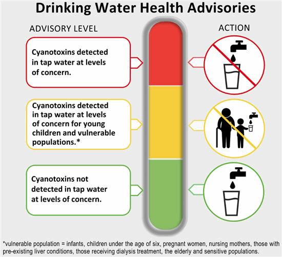 - “Drinking water advisory! Drinking water contains potentially harmful levels of cyanotoxins. Do Not Drink tap water in [location]. See: [insert website link]”