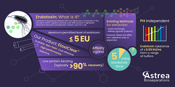 Etoxiclear™ is a high performance, non-ion-exchange, synthetic affinity chromatography adsorbent allowing cost effective and efficient endotoxin removal. Available as an adsorbent slurry for column packing and in an extensive range of disposable columns to suit your process. Etoxiclear™ adsorbent comprises a novel synthetic chemical bi-dentate ligand derived from Astrea’s Mimetic Ligand™ technology and is coupled to our proprietary PuraBead® 6XL base matrix which binds in a spatially selective and optimal manner to the LPS molecule. EtoxiClear™ can also remove endotoxin from a range of buffer solutions including PBS and other balanced salt solutions used in cell culture.