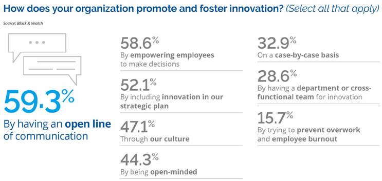The survey shows that water industry leaders strive to spark innovation through multiple means. More than half of respondents’ organizations promote innovation through open lines of internal communication, empowering employees to make decisions, and folding innovation into their strategic plans (Figure 1). Innovation is also encouraged in other ways.
