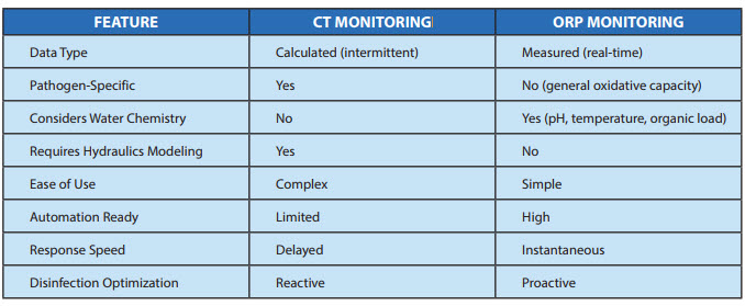 In a side-by-side comparison, CT provides a retrospective, theoretical assessment based on ideal assumptions. ORP offers a forward-looking, real-time measurement grounded in actual water chemistry. For operators focused on preventing outbreaks, meeting compliance targets, and modernizing water-system management, ORP represents a superior method of monitoring.