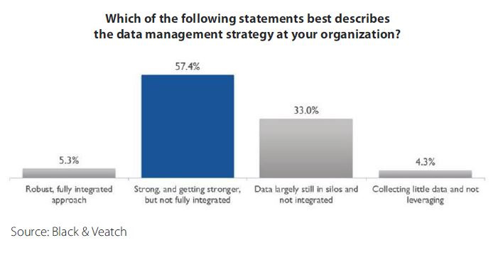 According to Black & Veatch’s 2019 Strategic Directions: Water Report survey of hundreds of water industry leaders in North America, a scant 5 percent of respondents reported that their organizations have adopted a robust, fully integrated approach to data management. Nearly six of 10 respondents said their data efforts were getting stronger but weren’t fully integrated. An additional one-third said their organization’s data remained siloed, while more than 4 percent of respondents said they collect little to no data, and whatever digital information they were capturing wasn’t being leveraged.