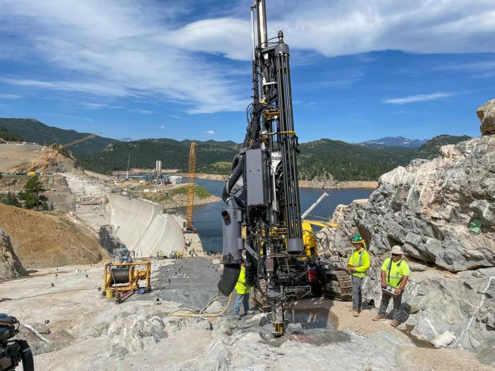Construction workers use a drilling rig to bore holes into the rock on both sides of the dam and inject grout. The process shores up the rock under the foundation. Photo credit: Denver Water.
