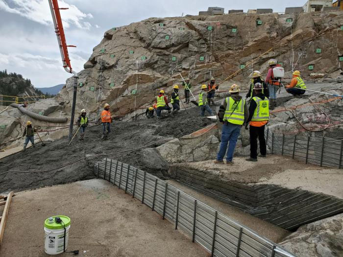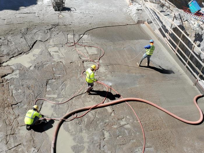 Workers place dental concrete on Gross Dam’s right abutment to fill in shallow irregularities in the rock surface after excavation. Photo credit: Stantec
