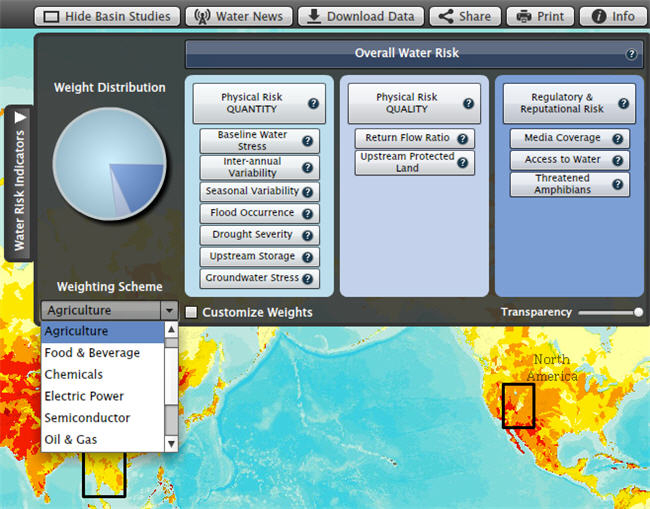 Agriculture is just one of many industries represented on the interactive map, however. Use the dropdown menu under “Weighting Scheme” to filter on a variety of industries and water risk data (see below). The map also reveals information beyond just groundwater depletion — drought severity, flood occurrence, and regulatory and reputational risk are among the variety of water considerations charted and assessed.