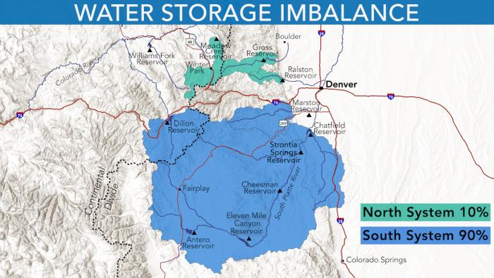 Denver Water has a water storage imbalance between its two collection systems with 90 percent of its reservoir storage located in the utility's South System compared to 10 percent in its North System. This storage imbalance creates vulnerability if there is a drought, mechanical issue, or emergency that affects the South System. The storage imbalance is one of the reasons Denver Water is expanding Gross Reservoir. (Credit: Denver Water)