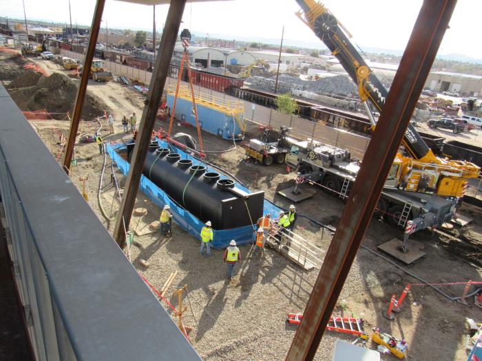 A tank, part of Denver Water's innovative on-site water capture and recycling facility, known as RUFUS, is lowered into place in October 2018. Photo credit: Denver Water