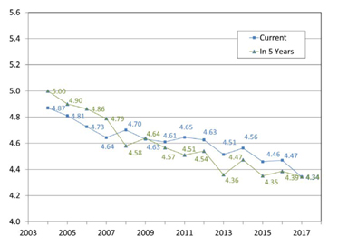 Figure 1. Feedback from AWWA water professionals shows declining trends in opinions for year-by-year overall state of the water industry and five-year projections for the industry.