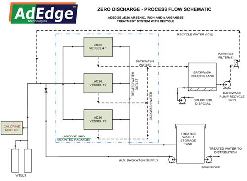 Nearly all water filtration related processes that remove target contaminants generate some liquid or solid residuals that need to be subsequently managed. Particularly with nuisance parameters such as iron and manganese, they present no hazards to human health or the environment. However, increasingly stringent regulatory discharge standards and emphasis on sustainability are demanding more environmentally friendly solutions for these residuals. Rapidly growing in popularity is AdEdge's H2Zero Backwash Recycle Systems. This configuration can be designed for arsenic adsorption or iron & manganese oxidation & filtration systems. Whether backwashing is infrequent (every 45-60 days in the case of adsorption for "fluffing" the media beds or performed one or more times per week using AdEdge can customize a solution to fit your need.