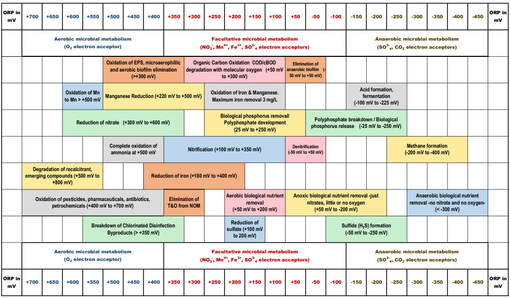 In aerobic systems such as activated sludge basins and trickling filters, maintaining ORP values between +300 and +400 mV supports the activity of aerobic bacteria, which are responsible for the oxidation of organic matter and ammonium. During nitrification, keeping ORP above +50 mV helps prevent nitrite accumulation and ensures complete conversion to nitrate.
