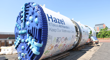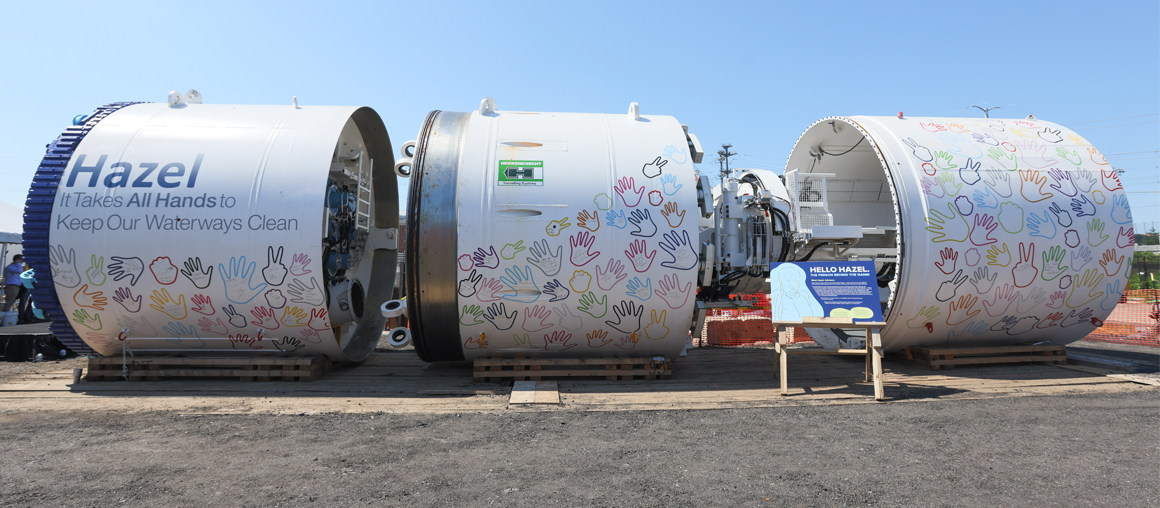 The arrival and dedication of the TBM is a major milestone for RiverRenew, the largest infrastructure project in Alexandria’s history, and a critical part of meeting a state-mandated deadline to remediate combined sewer overflows by July 1, 2025. Once lowered more than 100 feet below ground, Hazel will build the new two-mile Waterfront Tunnel with little service interruption on a journey estimated to take just over a year to complete.