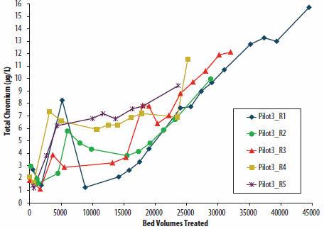 Figure 2. Total chromium results of Column 3 after five passes (regenerated with recycled brine after R2) at pilot scale